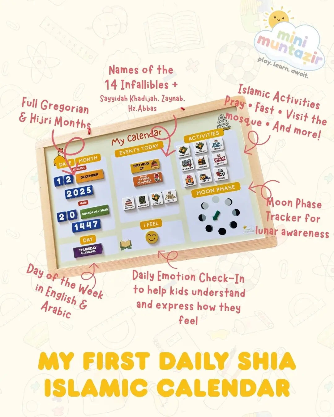 This bright, hands-on magnetic calendar is a wonderful way to keep little hands busy and curious minds ticking. Designed especially for children, it helps them explore Hijri and Gregorian dates, follow the moon’s journey, recognise important Shia occasions, and gently check in with how they are feeling each day.