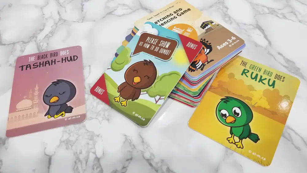 The card deck goes from the youngest age of 3, playing memory/matching with the cards, and gradually leads up to older players with first and second rakat timed sequencing games, first without, and then with, the Qunoot and Tasha-hud actions.